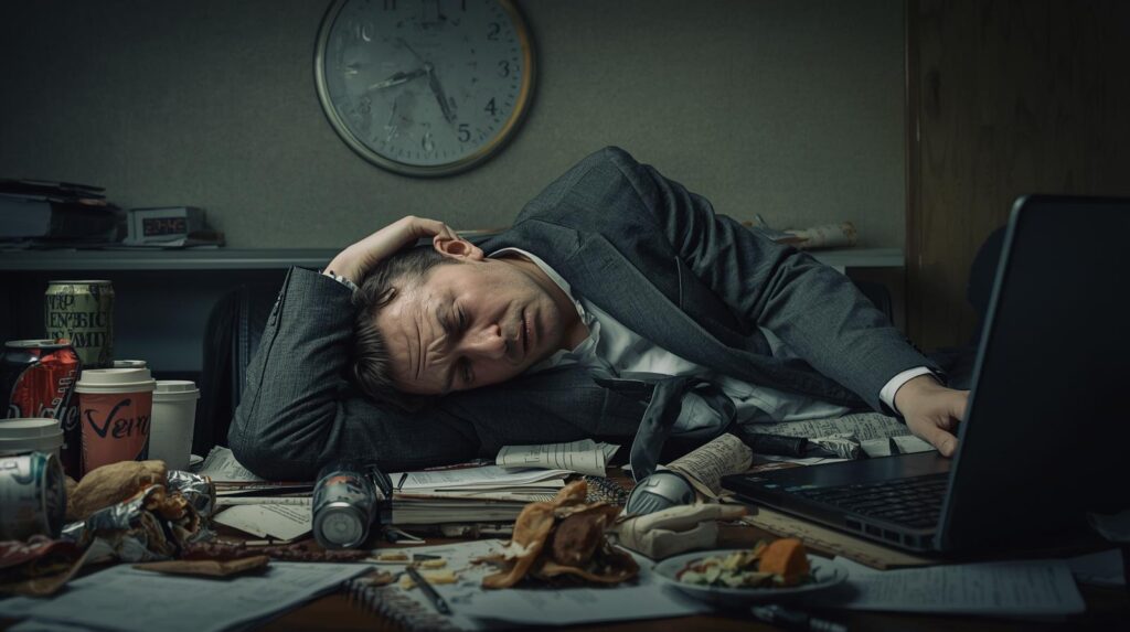 Now we go darker. Not just working too much — working too long without sleep, convincing yourself a 24-hour shift makes you a hero. Spoiler: it doesn’t. No medals. No promotions. Not even a “thanks.” Just the zombie starter pack: black rings under the eyes, coffee shakes, brain fog thick enough to choke on.